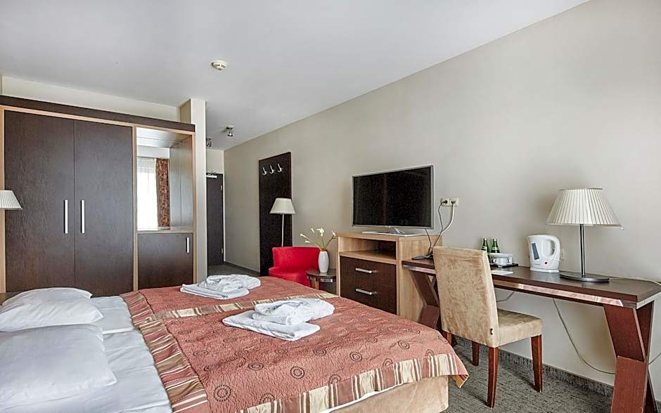 This spacious apartment consists of bedroom with two beds (can be joined) and a living room and fold out sofa bed. Guests have spa towels, tea, coffee and sugar at their disposal.